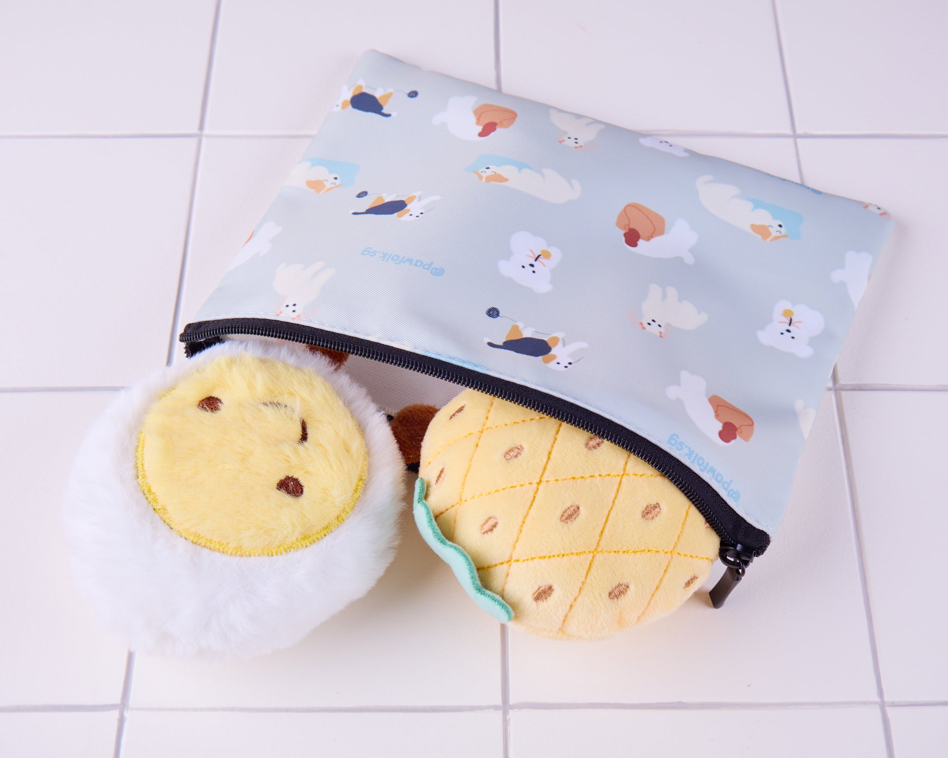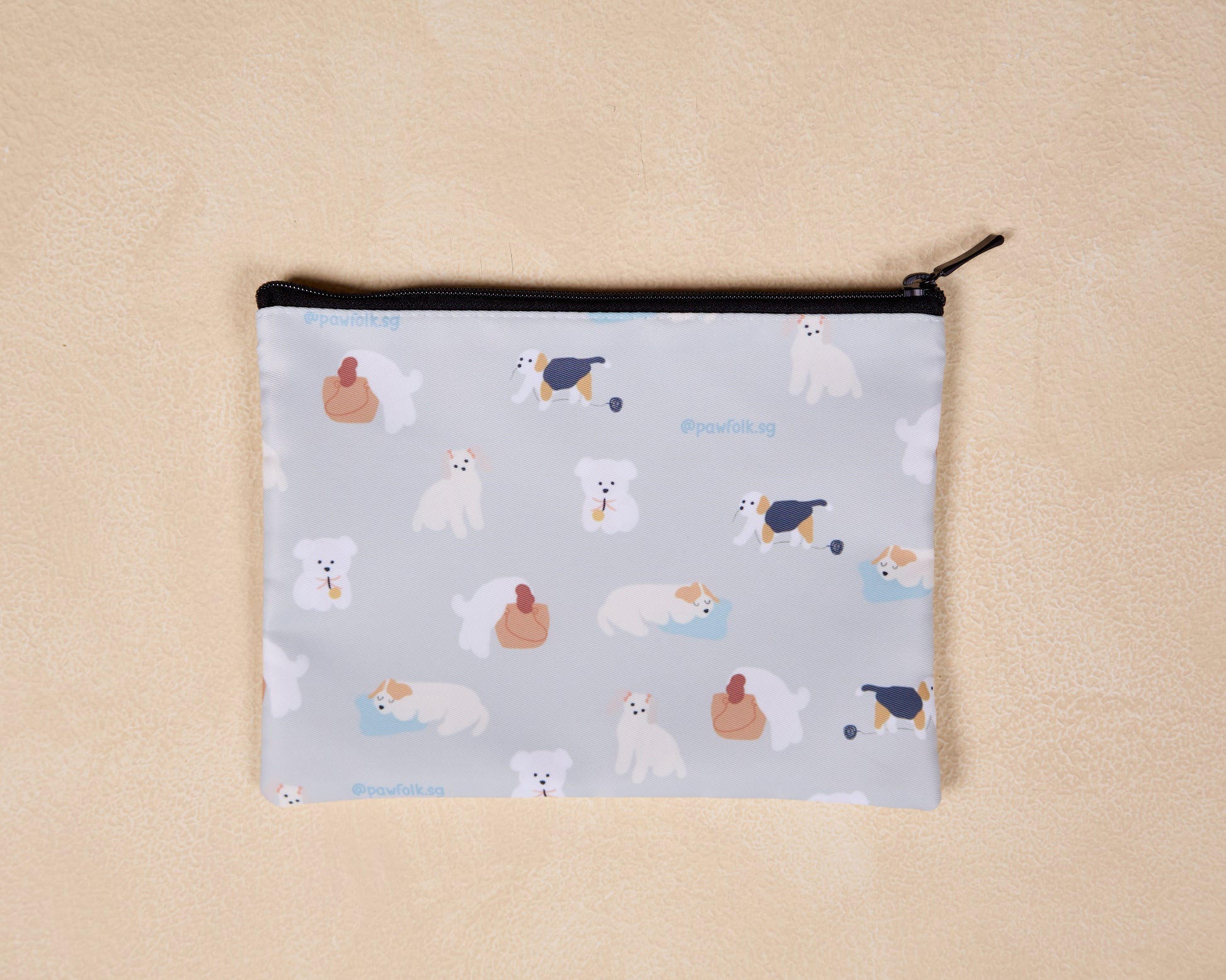 Carry your everyday must-haves with a touch of charm. This pouch features a delightful lineup of hand-drawn pups set against a playful blue background, bringing both cuteness and style to your essentials.